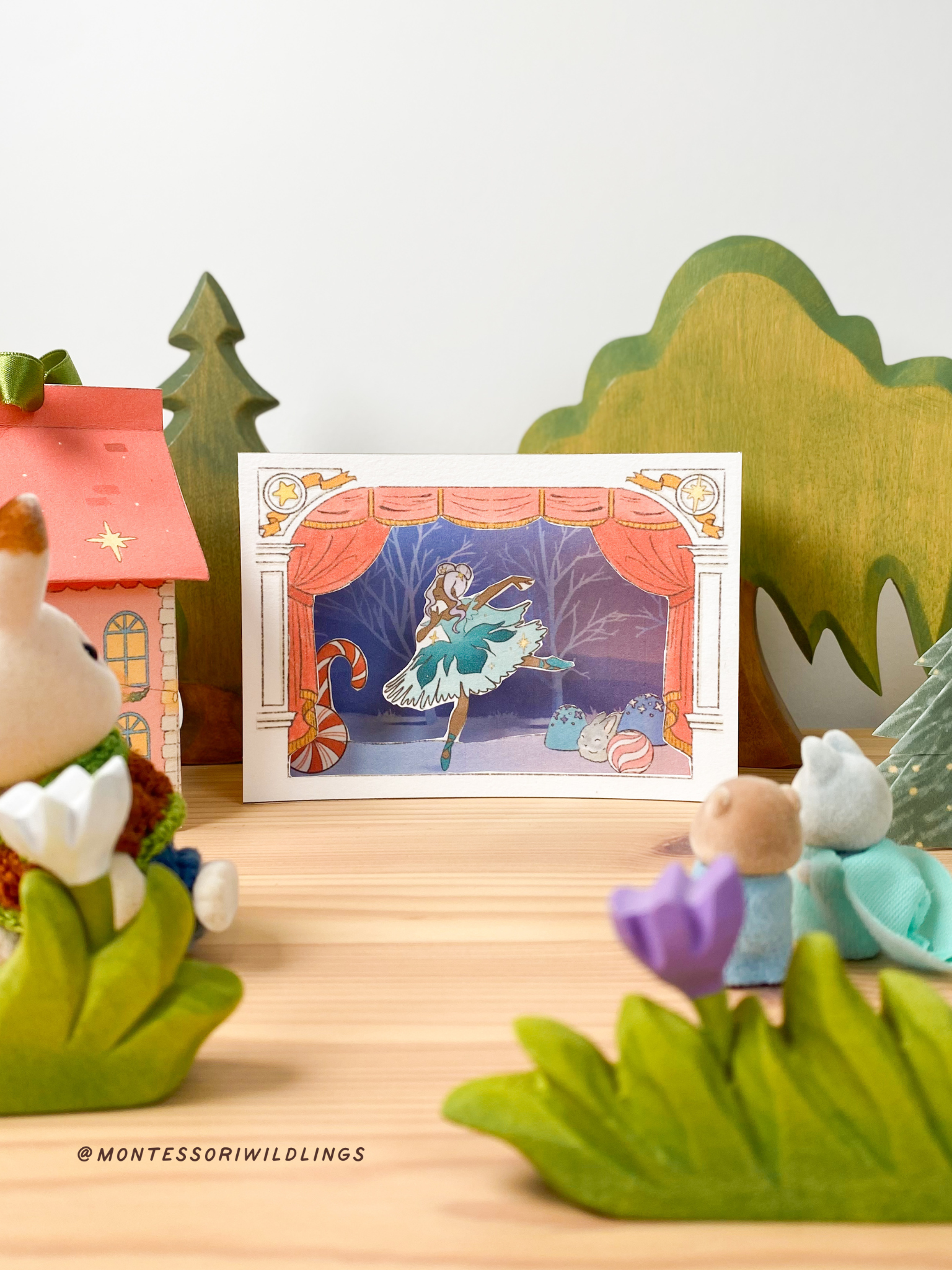 One of my daughters favourite crafts, this tiny theatre brings a touch of old-world charm to your craft table — a layered paper scene where the Sugar Plum Fairy takes centre stage. With the help of their adult, children are invited to cut, fold, and assemble their own stage, complete with curtains, backdrop, and delicate details. With its blend of storytelling, spatial awareness and fine motor skills, this project encourages care, imagination, and creative play. Whether it becomes part of a seasonal shelf or a scene for retelling the Nutcracker story, this miniature theatre invites children into step inside a magical mini ballet show!